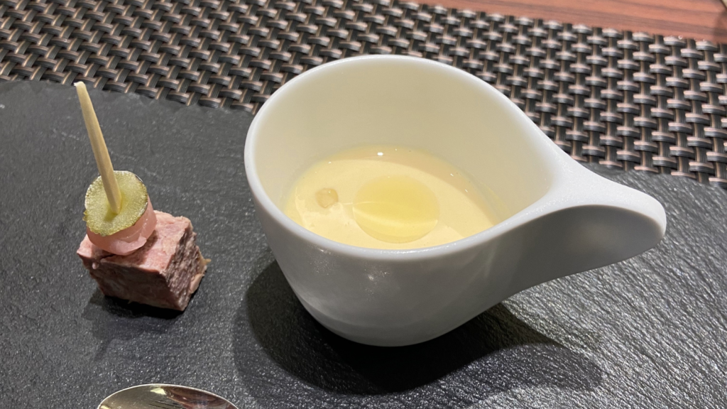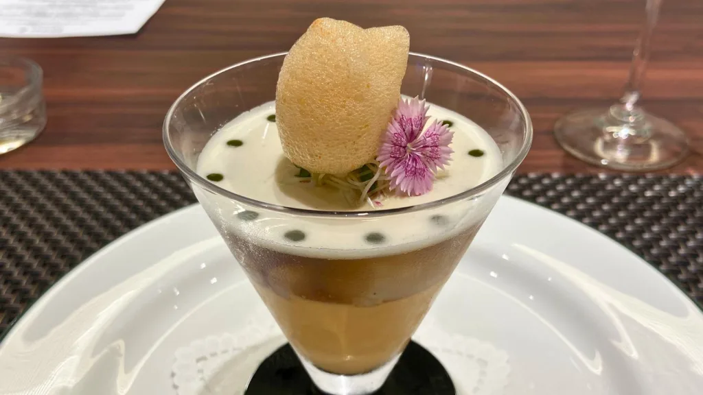 まず目を引いたのは、その鮮やかな色合い。グラスの底から、オレンジ色の人参のムース、透明感のある甲殻類のコンソメジュレ、そして上層には白いカリフラワーのムースと、それぞれの層がはっきりと分かれており、見ているだけでワクワクする気分に!