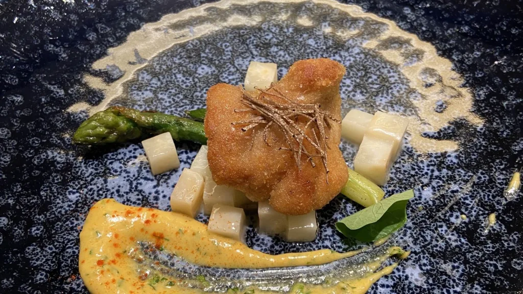 外側はしっかりと焼き上げられ、中はジューシーで、その旨味が口の中で広がりました。さらに、添えられていた根セロリとアスパラのソテーは、シャキシャキとした食感が楽しめ、リ・ド・ヴォーとの相性も抜群!そして、香草風味のサヴァイヨンソースが全体の味をまとめ上げ、一皿の中でさまざまな味わいを楽しむことができました。