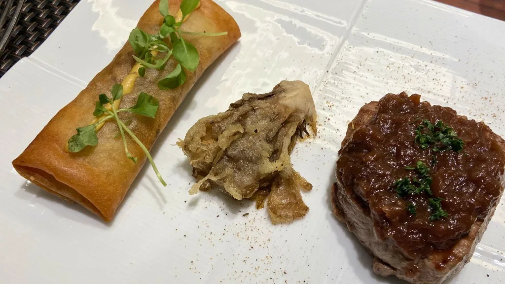 仔羊背肉は、外側は香ばしさを持ちながら、中は柔らかくジューシー。その肉の質感と深い味わいが、シャリアピンスタイルの技法と相まって、絶妙なハーモニー!そして付け合わせは、お肉やキノコが入った春巻きとキノコのフリットです。