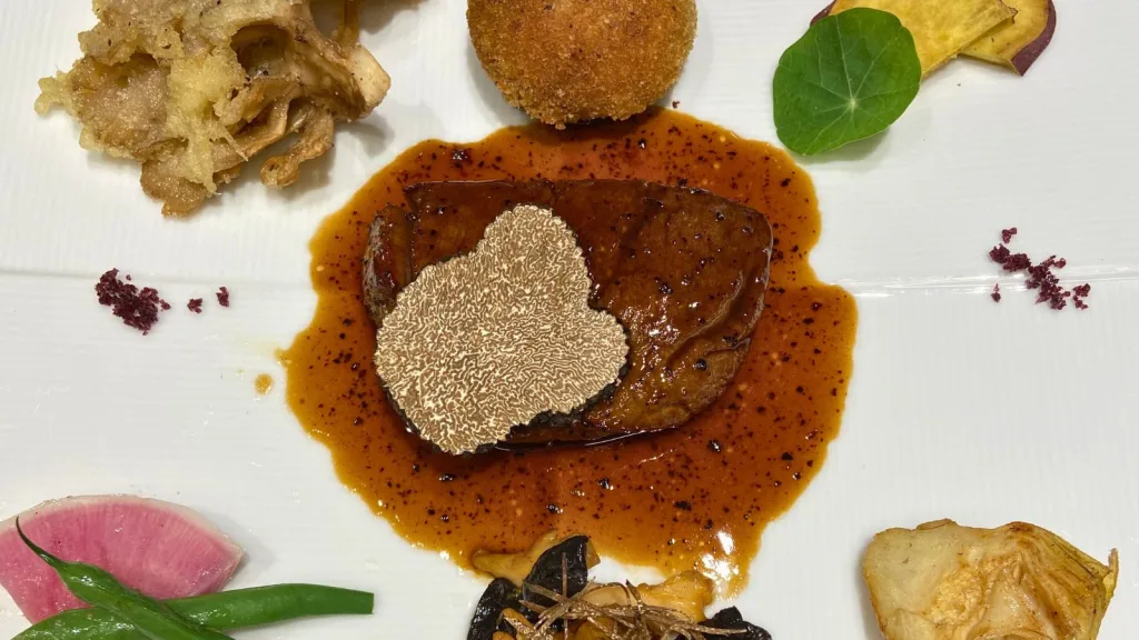 そしてヒレ肉!美しい焼き色とロゼ色の断面、その上に乗せられた厚切りのトリュフ。のざき牛は鹿児島県産の高級和牛で、その肉質の柔らかさと深い旨味は他の牛肉とは全く別物!!