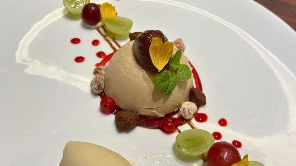 最後のデザートは秋の味覚、栗のムースと梨のソルベ、シャインマスカットなどのブドウが添えられていました。